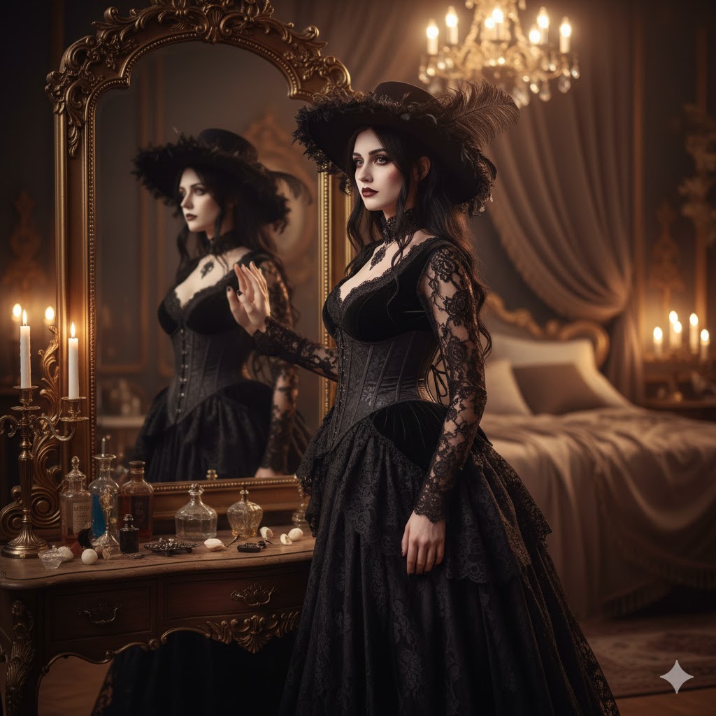 {{Subject: A woman in front of a mirror dressed in gothic style (e.g.)}}, rendered in {{Engine:[render_engines]}}, {{Palette:[color_palettes]}} color palette, featuring {{Effect:[visual_effects]}}
