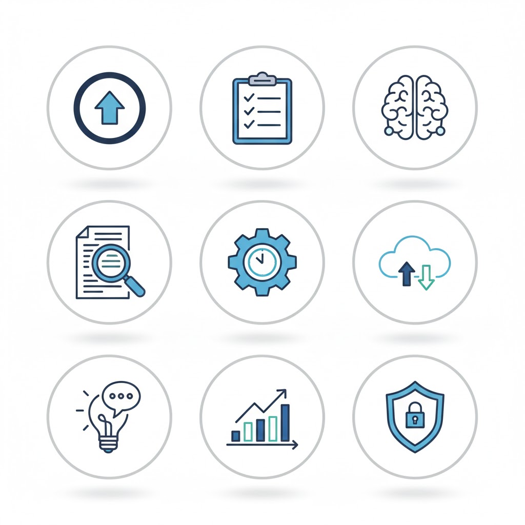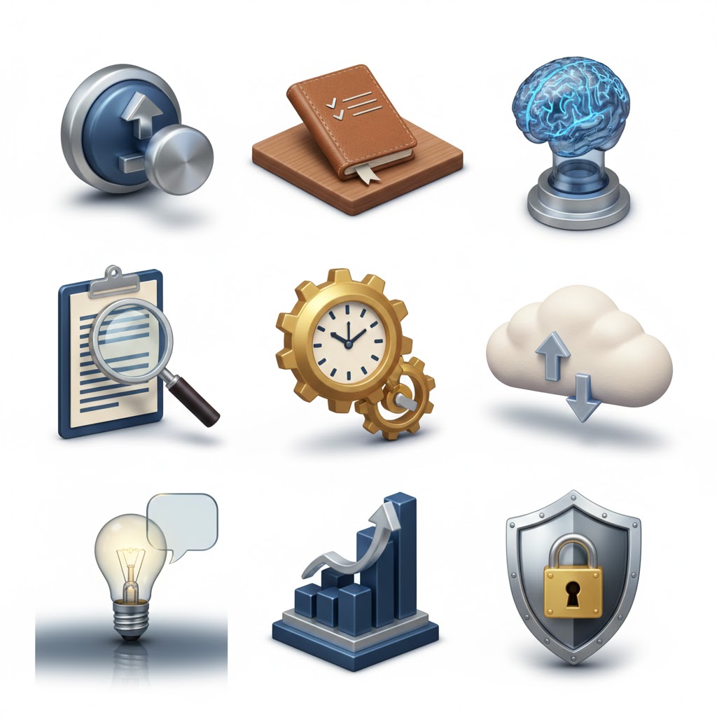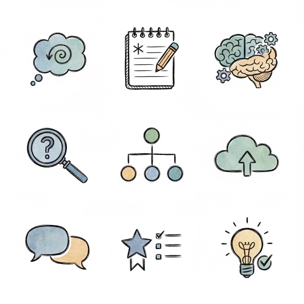 Create a collection of icons representing {{Theme:Topic}}, belonging together as a single theme. Arrange them in a 3x3 grid on a pure white background. Design the icons in a {{Design Styles: [design_styles]}} style. No text. Ensure visual consistency across all {{Icon Count:9}} icons.