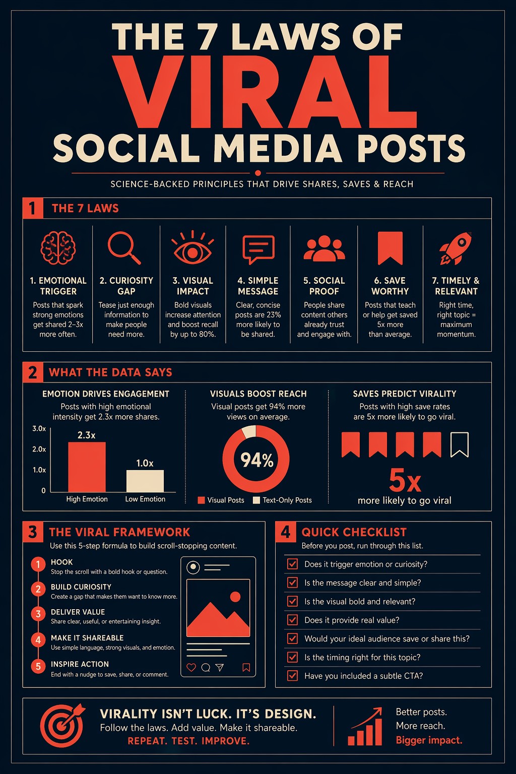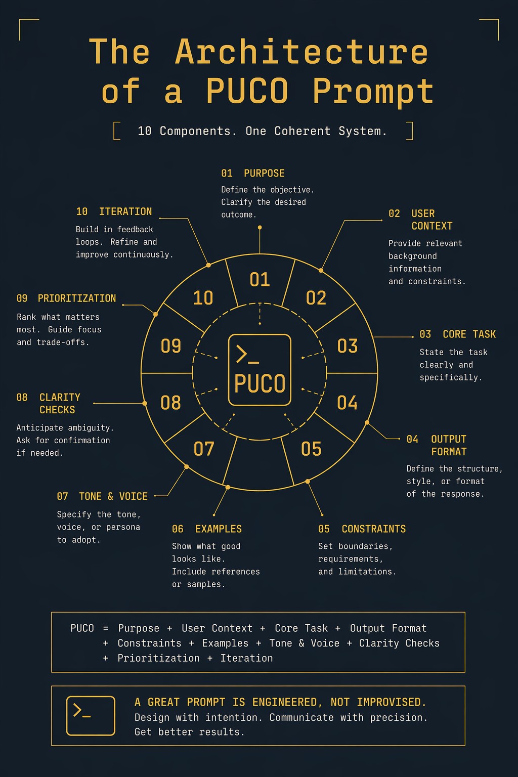 Create a single-page editorial infographic titled "{{Subject: The Architecture of a PUCO Prompt, Your 2026 Personal Stats Card, The 7 Laws of Viral Social Media Posts}}" in the style of a premium magazine data spread. Visual style: Information design meets editorial print. Layout: {{Layout: Clean portrait with 4 sections, Balanced two-column spread, Focused central diagram}}. Color palette: {{Color Palette: Midnight Navy and Coral, Forest Green and Cream, Deep Slate and Gold}}. Typography: {{Typography: Bold geometric sans-serif, High-contrast elegant serif, Clean minimalist monospace}}. Composition: Centered layout with {{Margin: 10-25}}% breathing margin on all sides and balanced whitespace. Lighting: Flat design with no gradients. Aspect ratio: {{Aspect Ratio: 2:3, 3:4, 9:16}}. Negative constraints: No blurry or garbled text, no clipart, no overcrowded layout, no watermarks, no generic textures.