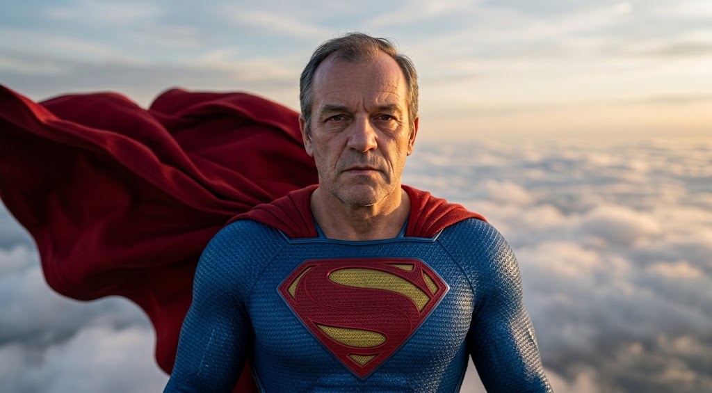 Transforms a subject into a superhero using professional filmmaking techniques, cinematic lighting, and realistic skin textures.