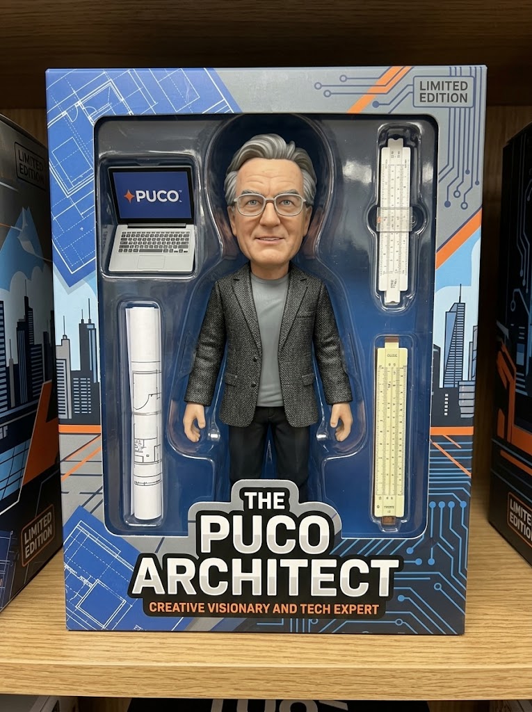 Generate a high-fidelity, realistic image of the person from the attached photo as a professional collectible action figure secured inside its retail window-box packaging. The figure's sculpt must accurately reflect the person's likeness and attire. The packaging should prominently display the name "{{Name:e.g. The PUCO Architect}}" and include at least three miniature accessories representing their interests, specifically: {{Accessories:e.g. a laptop with a PUCO sticker, a specialized toolkit, and a travel mug}}. The design style should be {{Style:Modern High-End, Retro 90s Classic, Stylized Vinyl, Cyberpunk}}. Ensure the box art and background graphics emphasize the character's vibe as {{Personality:e.g. a creative visionary and tech expert}}.