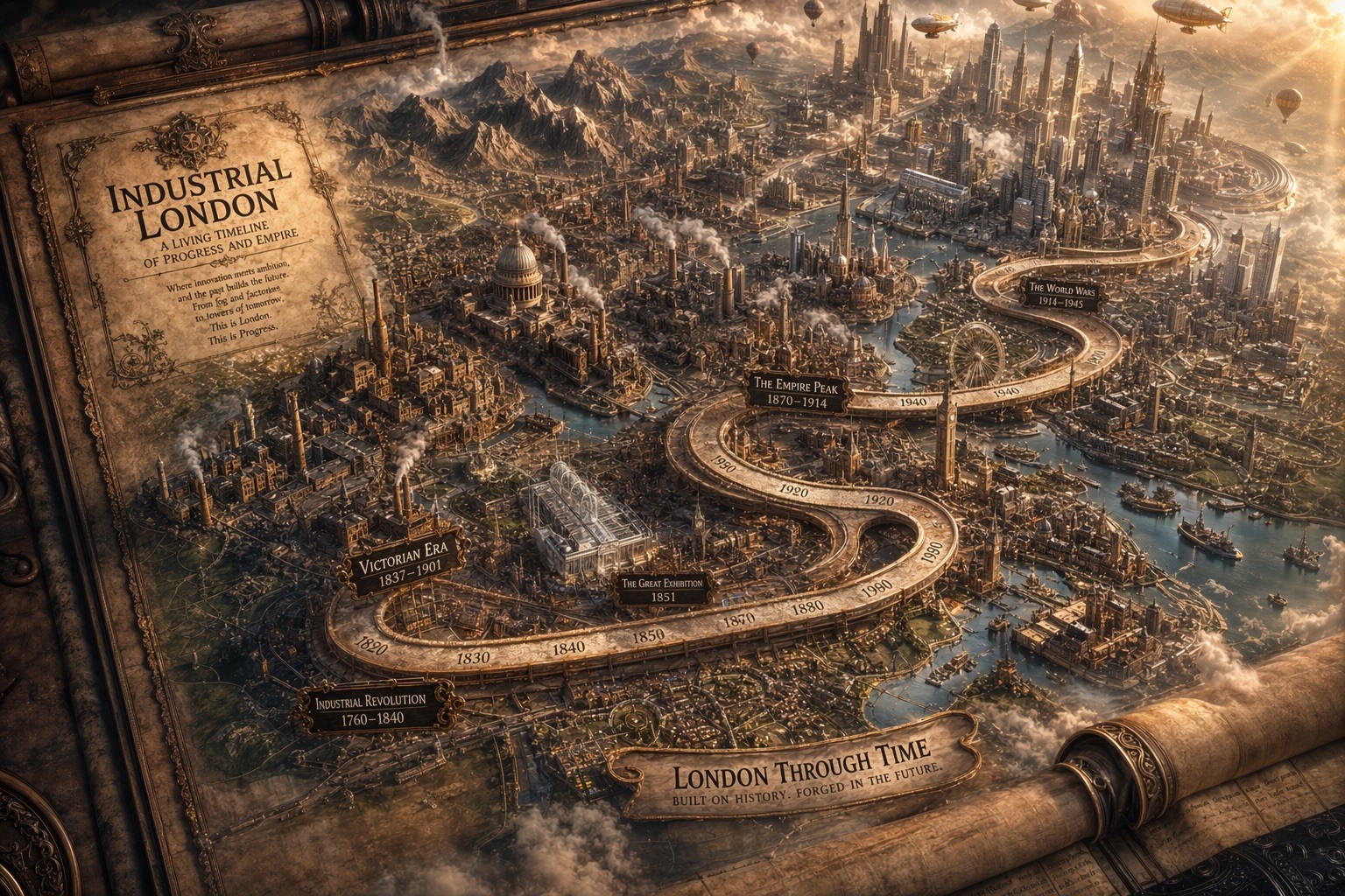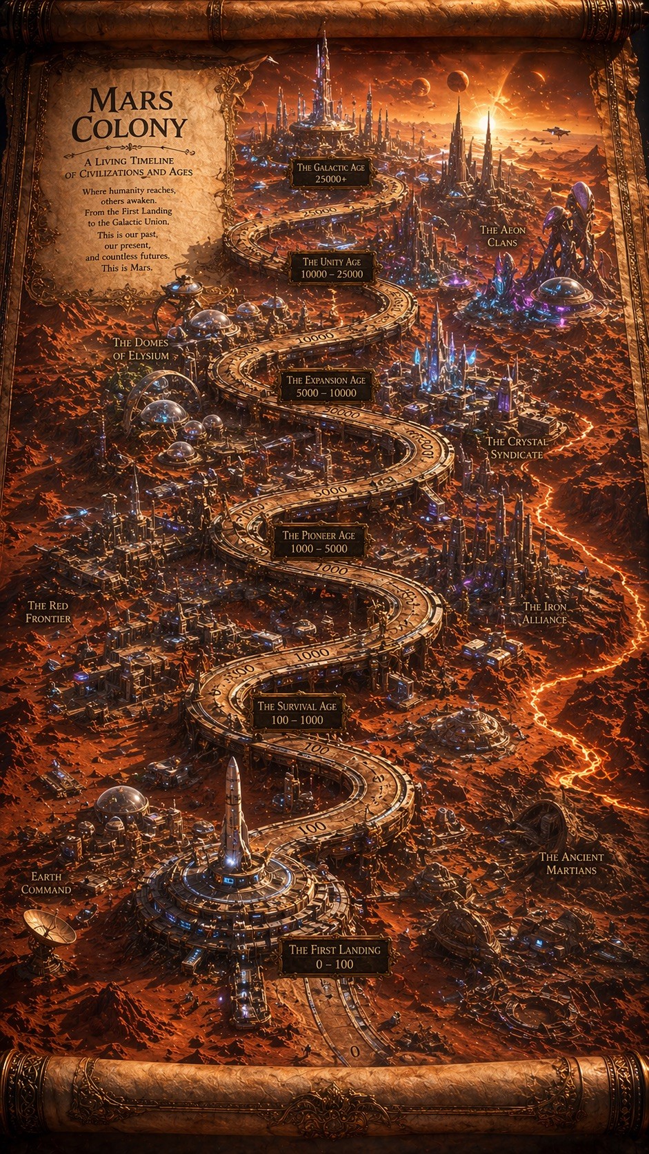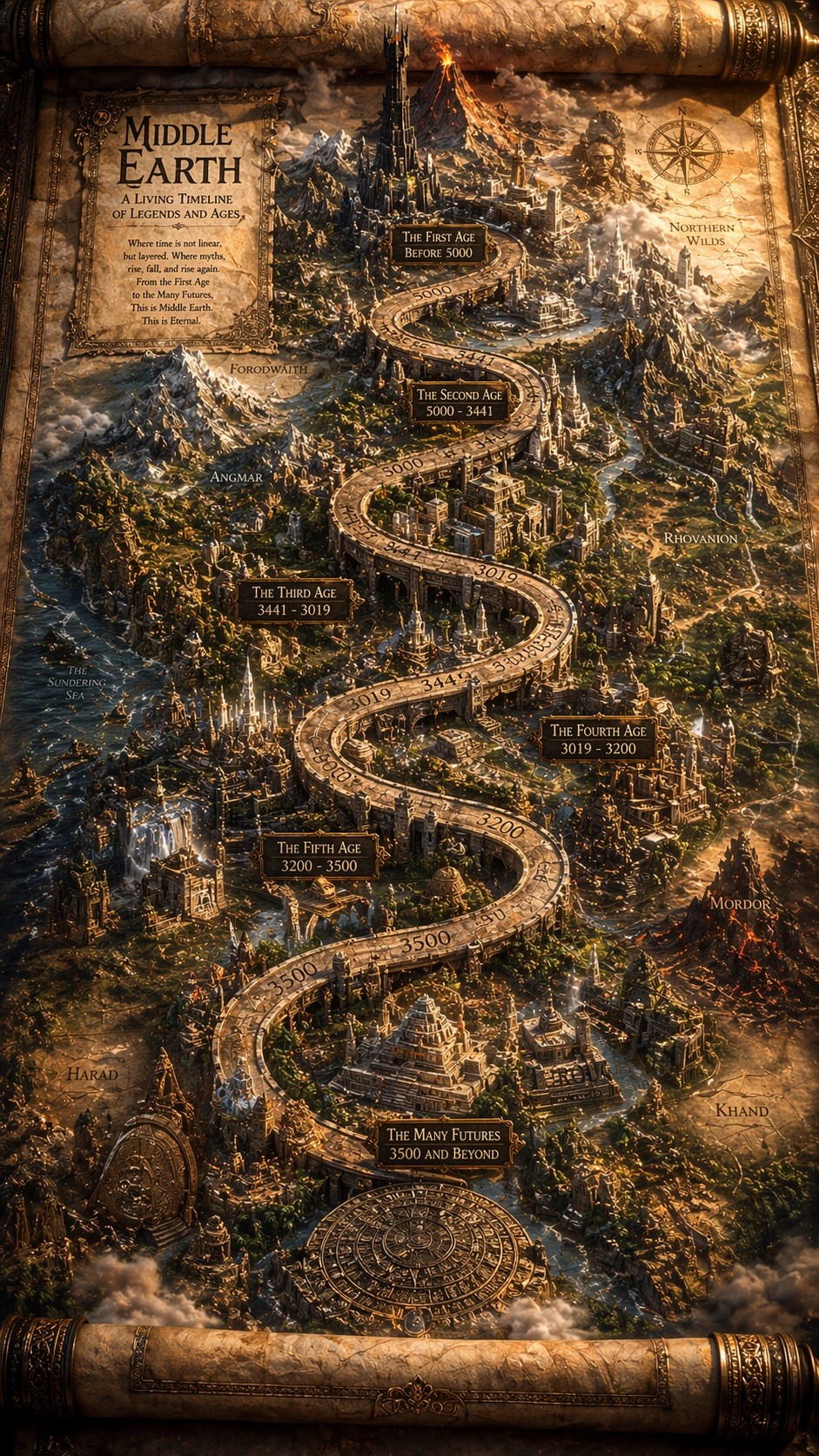 Epic 3D isometric atlas scene: a massive ancient map of {{Subject: # Landscapes, Mount Olympus, Yggdrasil, Atlantis, Mars Colony, # History, Ancient Rome, Industrial London, Feudal Kyoto, # Fantasy, Middle Earth, Forgotten Realms, Sky Islands}} erupts from an unfurled parchment scroll, filling nearly the entire frame. Ink lines ignite into living terrain: mountain ranges push upward, cities rise in vertical layers, rivers glow and flow, borders burn softly in gold. Multiple civilizations {{Civilizations: Steampunk and Victorian, Roman and Byzantine, Mayan and Aztec, Cyberpunk and Synthwave, Medieval and Renaissance, Ancient Egyptian and Nubian, Feudal Japanese and Edo, Futuristic and Alien, Pirate and Colonial, Prehistoric and Ice Age}} coexist in stacked time, their architectures phasing through one another as if time is folding. A carved timeline spirals across the map with engraved dates. All text in {{Language:[languages]}}. Extreme scale contrast, dense micro-detail everywhere, dramatic golden-hour light, volumetric dust, cinematic depth, 8K, UE5.