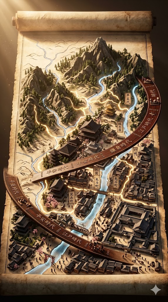 Creates a living, three-dimensional ancient map erupting from a parchment scroll with layered civilizations and terrain.