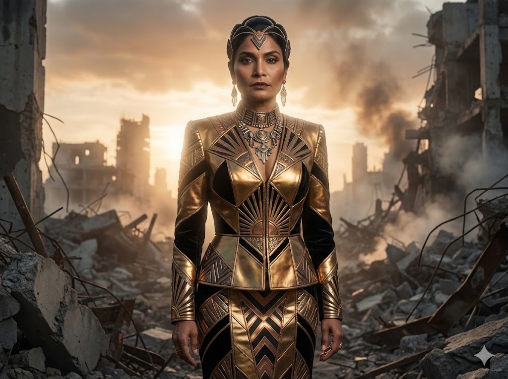 Subject: A model wearing a bold {{Fashion:[fashion_styles]}} outfit.