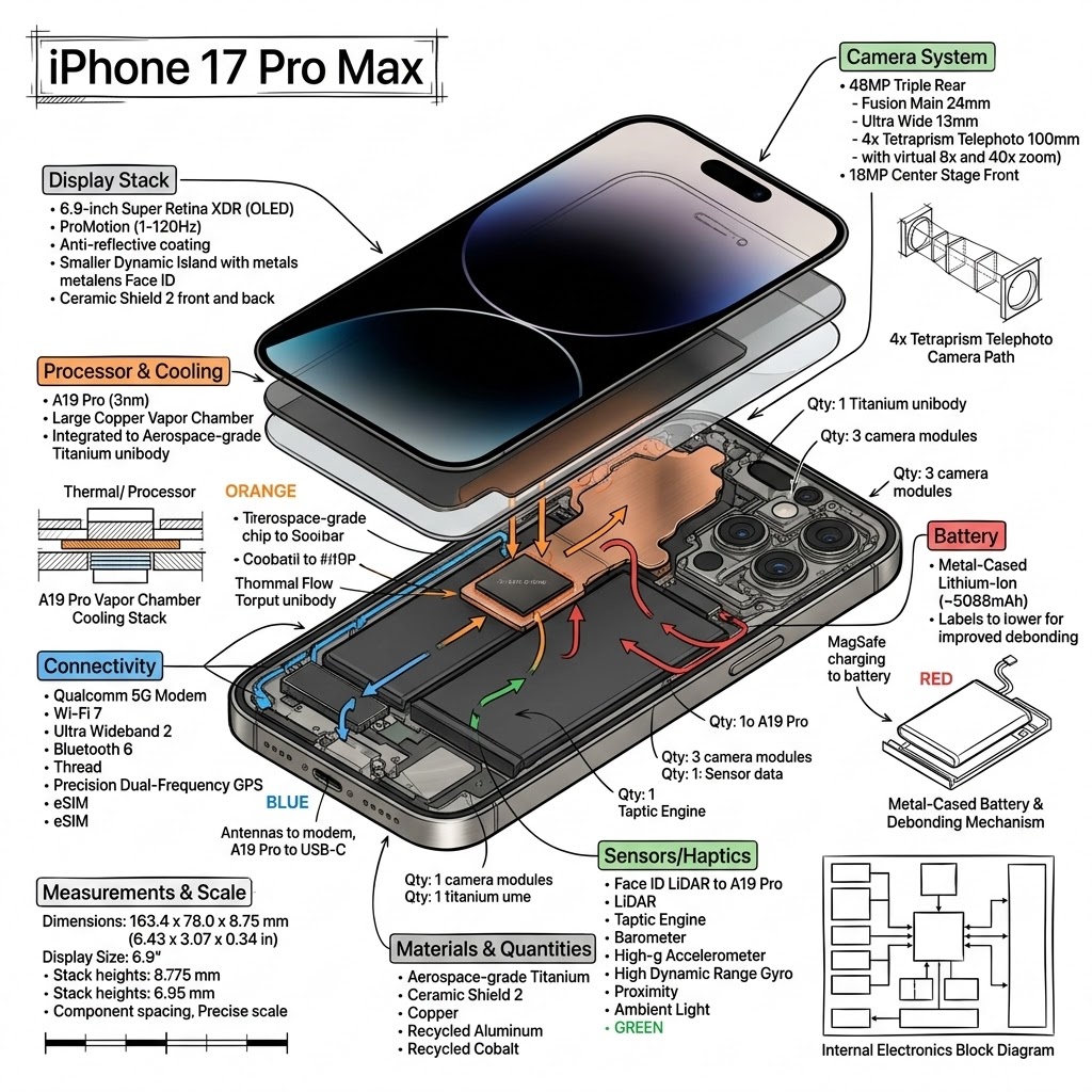 5. Color-coded arrows for function/flow: RED (power/battery), BLUE (data/connectivity), ORANGE (thermal/processor), GREEN (sensors/haptics).