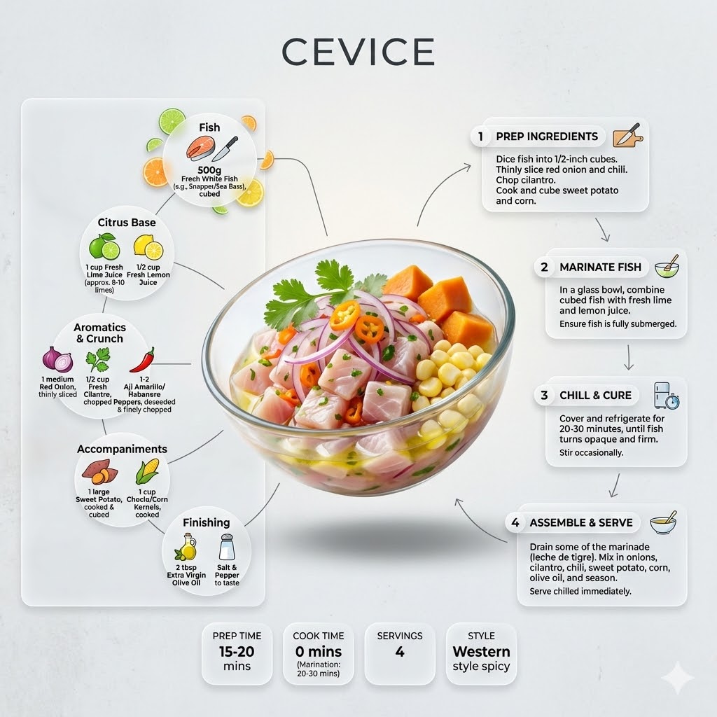 Generates a premium, dynamic recipe layout with a hero dish surrounded by ingredient icons and step-by-step panels.