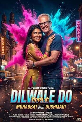 Transform the subject(s) in the attached photo into a grand Bollywood {{Genre: Epic Love Story, Science fiction, History Drama}} movie poster, dramatic heroic pose, swirling clouds of vibrant {{Colors: Pink and neon blue, Orange and yellow, Purple and green, Vibrant rainbow}} gulal powder, {{Background: Majestic palace courtyard, Bustling city street, Serene mountain temple, Genre typical Scenery}} background, intense cinematic lighting, ultra-realistic skin textures, 8k resolution, bold title font at the bottom.